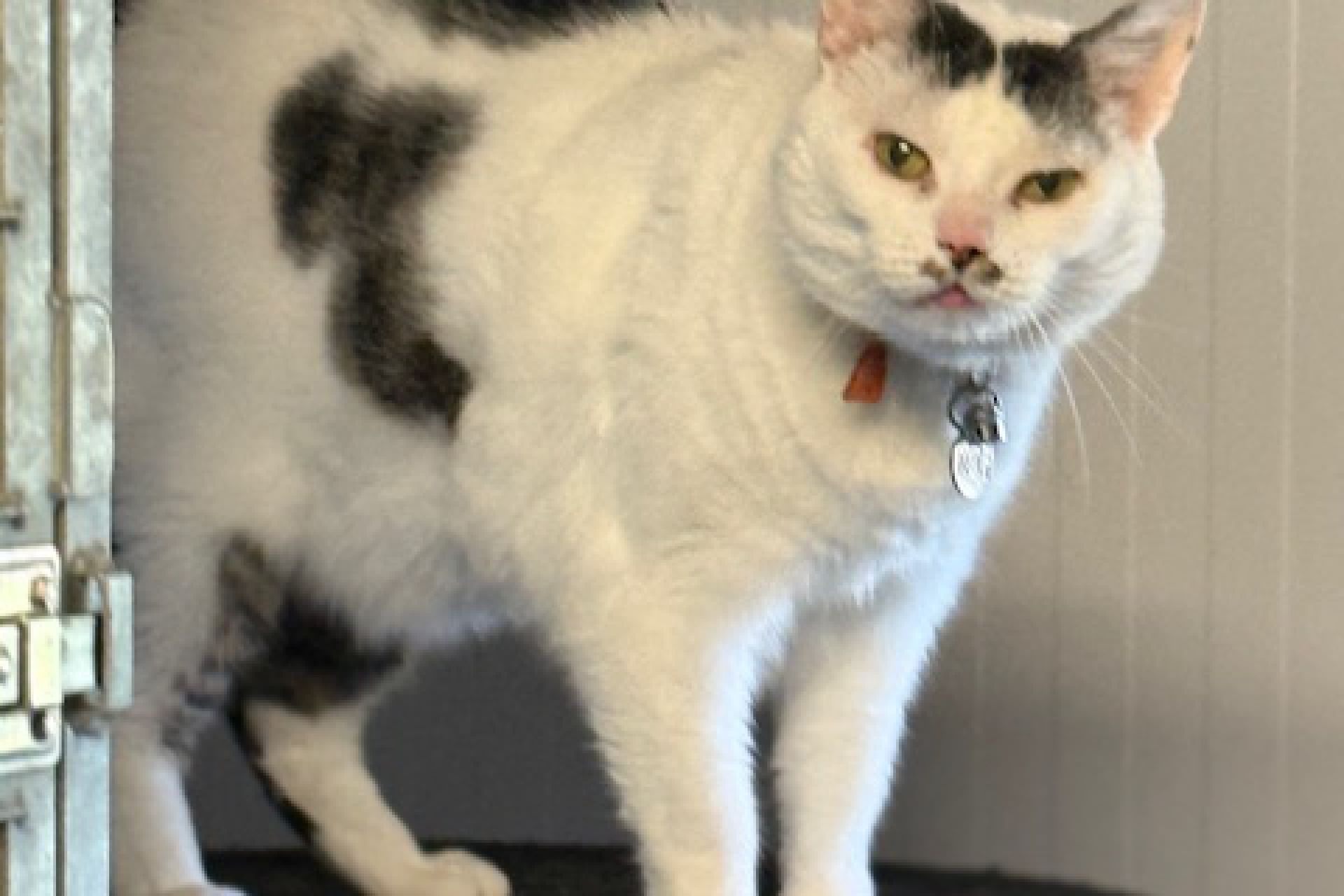 Basje is wit met grijze (cyperse) vlekken, heeft een lang lijf, en een grijs "snorretje" onder de neus.